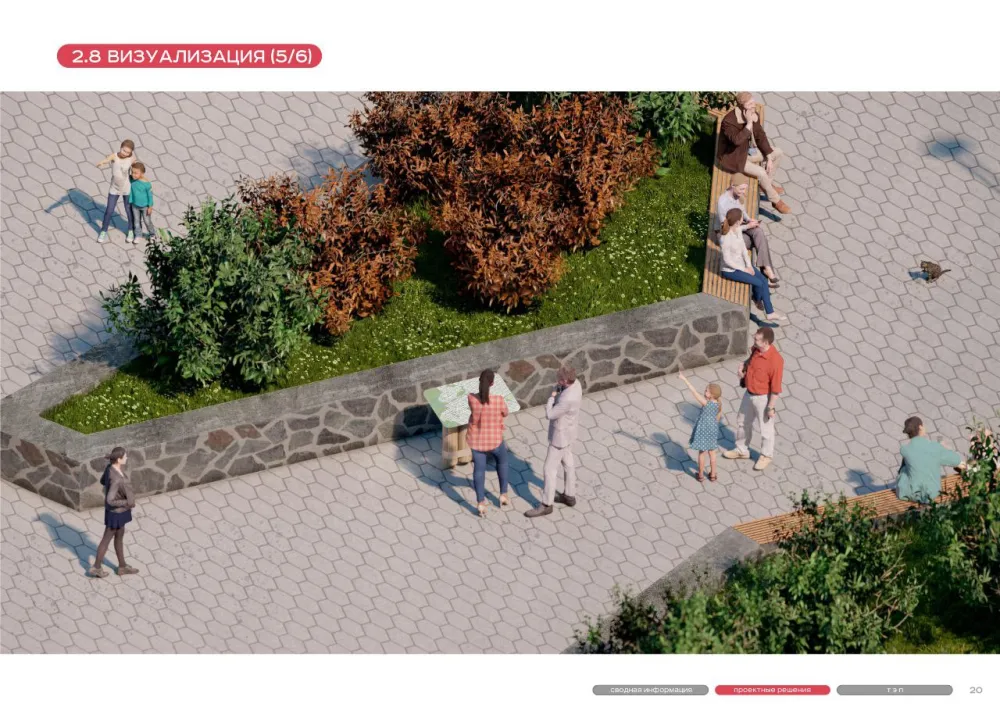 Уникальность территории придают перепады высот. Часть подпорных стенок будет сохранена, превратившись в удобные места для сидения. Уровни планируется обыграть разными видами мощения, что отразится на общем виде пространства.