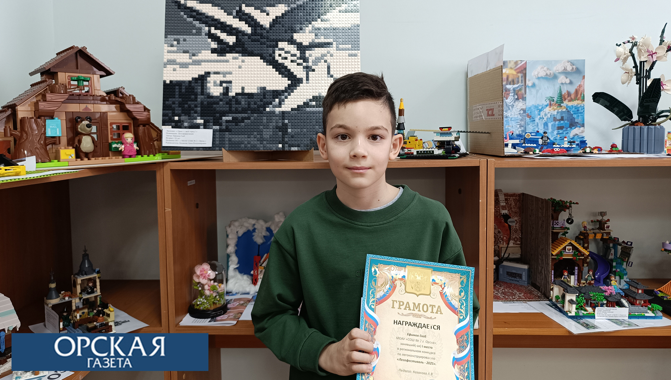 Единогласный высший балл от членов жюри заслужил экспонат «Орск – мой город!». Ученик 4 «В» класса школы № 2 Глеб Ефимов создал панно: из мельчайших кубиков лего выложил самолет, украшающий площадь Гагарина. Мальчик – опытный участник подобных выставок, поэтому на этот раз решил соорудить что-то особенное.