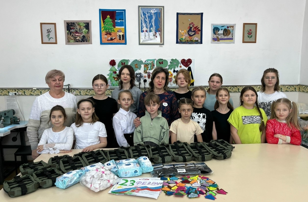 Дети с огромным интересом рассматривали настоящее снаряжение. Они увидели носилки «Фома», узнали, что такое пятиточечник и сбросник, познакомились с подсумками для магазинов АК, а также с большими и малыми ампульцами. Особенно внимательно слушали девочки, ведь им скоро предстоит применить полученные знания на практике. Под руководством педагога Галины Милёшиной они уже отшили заготовки для аптечек, а теперь будут помогать Ольге Викторовне, изготавливая заготовки для пятиточечников и сбросников.